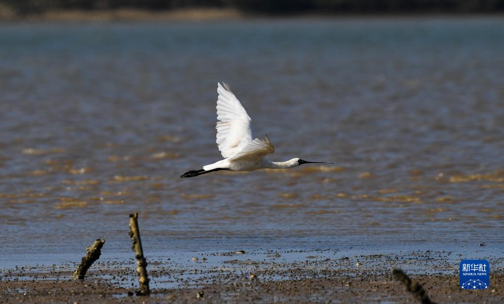 1月27日,在海南新盈红树林国家湿地公园,一只黑脸琵鹭在滩涂上飞翔。近期,记者在2022年海南越冬水鸟调查暨全国黑脸琵鹭同步调查结束后获悉,该次调查共记录到145只国家一级重点保护野生动物黑脸琵鹭,创下了自2003年海南开展黑脸琵鹭同步调查以来的最高纪录。新华社记者 杨冠宇 摄