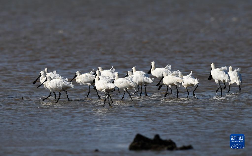 1月27日,在海南新盈红树林国家湿地公园,黑脸琵鹭在滩涂上觅食。近期,记者在2022年海南越冬水鸟调查暨全国黑脸琵鹭同步调查结束后获悉,该次调查共记录到145只国家一级重点保护野生动物黑脸琵鹭,创下了自2003年海南开展黑脸琵鹭同步调查以来的最高纪录。新华社记者 杨冠宇 摄