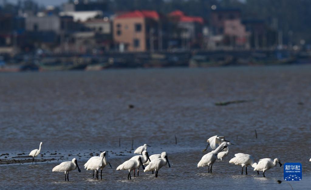 1月27日,在海南新盈红树林国家湿地公园,黑脸琵鹭在滩涂上休憩。近期,记者在2022年海南越冬水鸟调查暨全国黑脸琵鹭同步调查结束后获悉,该次调查共记录到145只国家一级重点保护野生动物黑脸琵鹭,创下了自2003年海南开展黑脸琵鹭同步调查以来的最高纪录。新华社记者 杨冠宇 摄