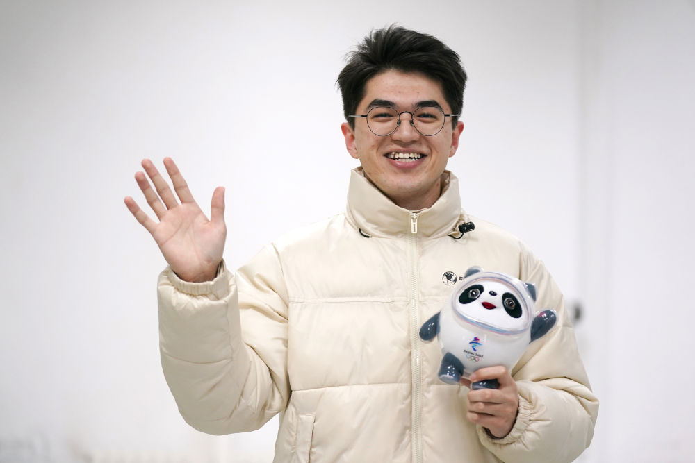 北京邮电大学的学生志愿者艾尔西丁·艾尼瓦尔拿着2022年北京冬奥会吉祥物冰墩墩挥手致意(2021年12月15日摄)。