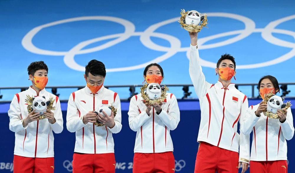 2月5日,中国队选手在北京冬奥会短道速滑项目混合团体接力颁纪念品仪式上。