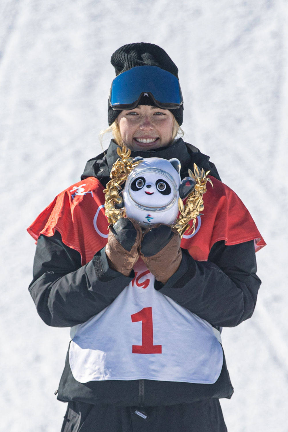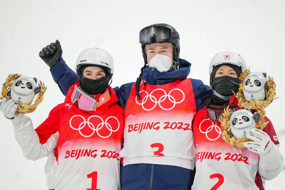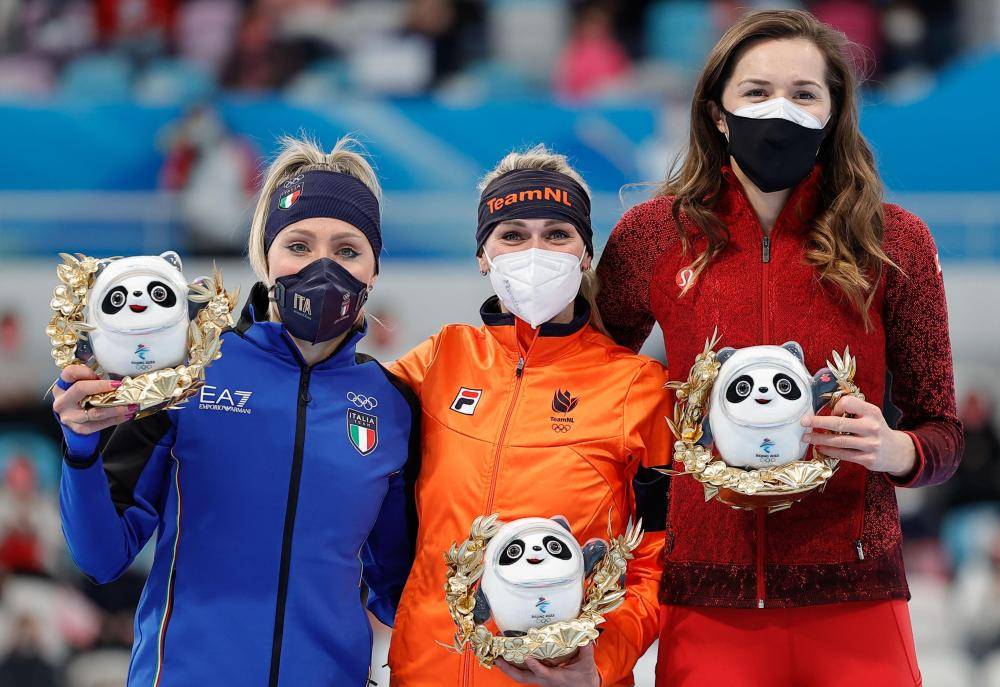 2月5日,在北京冬奥会速度滑冰女子3000米颁发纪念品仪式上,冠军荷兰选手伊雷妮·斯豪滕(中)与亚军意大利选手弗兰切丝卡·洛洛布里吉达(左)、季军加拿大选手伊莎贝尔·韦德曼手拿冰墩墩玩偶。