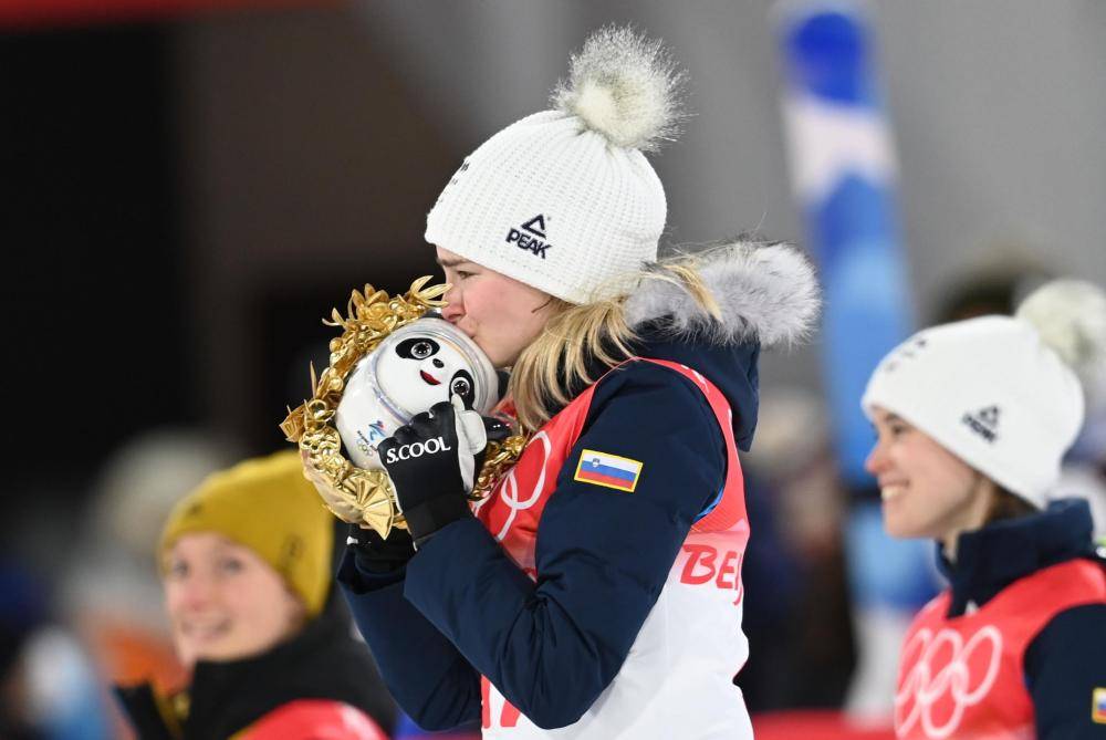 2月5日,季军斯洛文尼亚选手妮卡·克里兹纳尔(前)在北京冬奥会跳台滑雪女子个人标准台颁发纪念品仪式上。