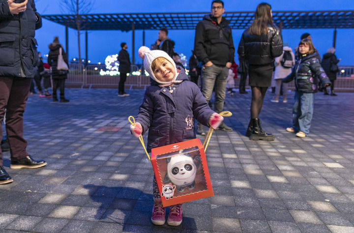 1月31日,在塞尔维亚贝尔格莱德举行的中国灯展上,一名儿童手捧北京冬奥会吉祥物“冰墩墩”。
