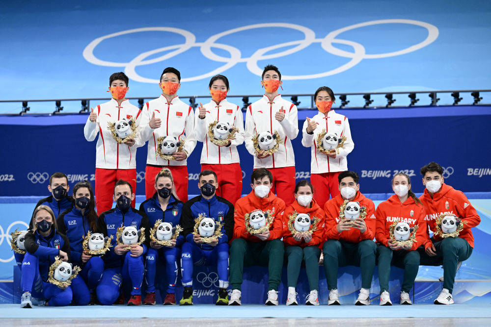 2月5日,冠军中国队选手(上)与亚军意大利队选手(下左)、季军匈牙利队选手在北京冬奥会短道速滑项目混合团体接力颁纪念品仪式上。