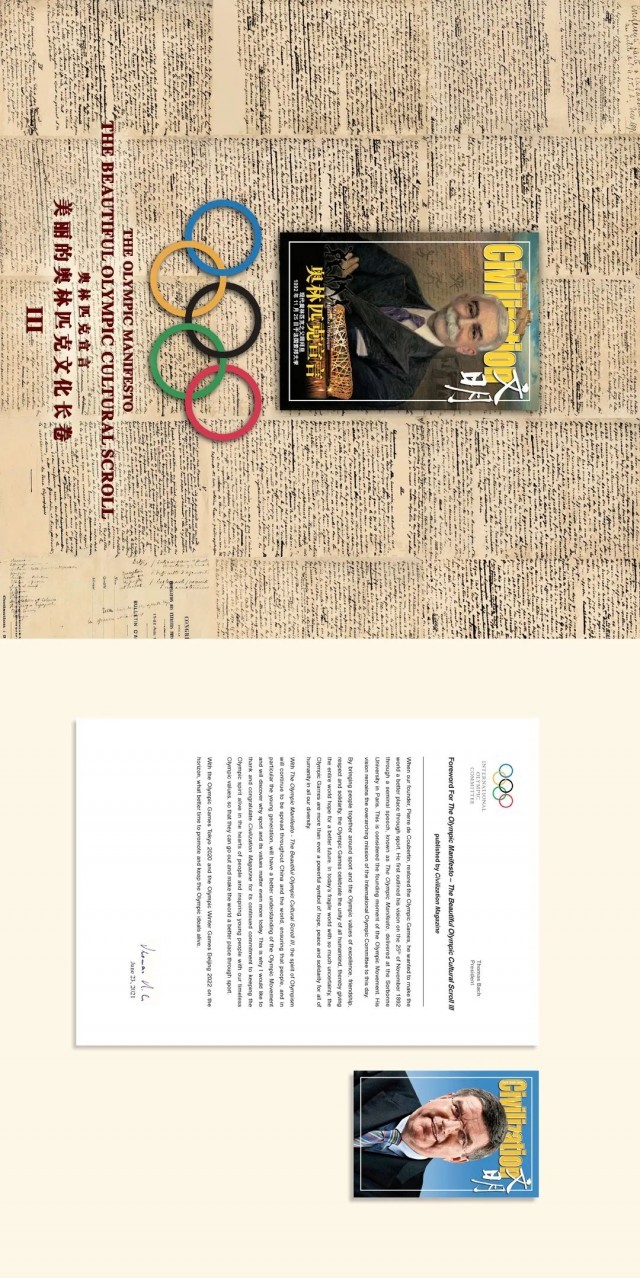 近20年来,首都文明工程基金会与《文明》杂志一直以携手国际奥委会推出国际第一套“奥林匹克文化读本”、建成世界第一个“奥林匹克宣言广场”和连接世界的纽带《奥林匹克文化长卷》为载体,把促进奥林匹克文化的传承发展与互动传播作为东西方文化交流融合的一个平台和纽带。《奥林匹克文化长卷Ⅲ》是继2012年推出的《奥林匹克文化长卷Ⅰ》和2016年推出《奥林匹克文化长卷Ⅱ》之后历时十年推出的第三部文化长卷。《奥林匹克文化长卷》系列已经成为由国际奥委会指导,奥林匹克大家庭共同参与,在中国形成并贡献给世界的奥林匹克文化传播互动的平台与载体。