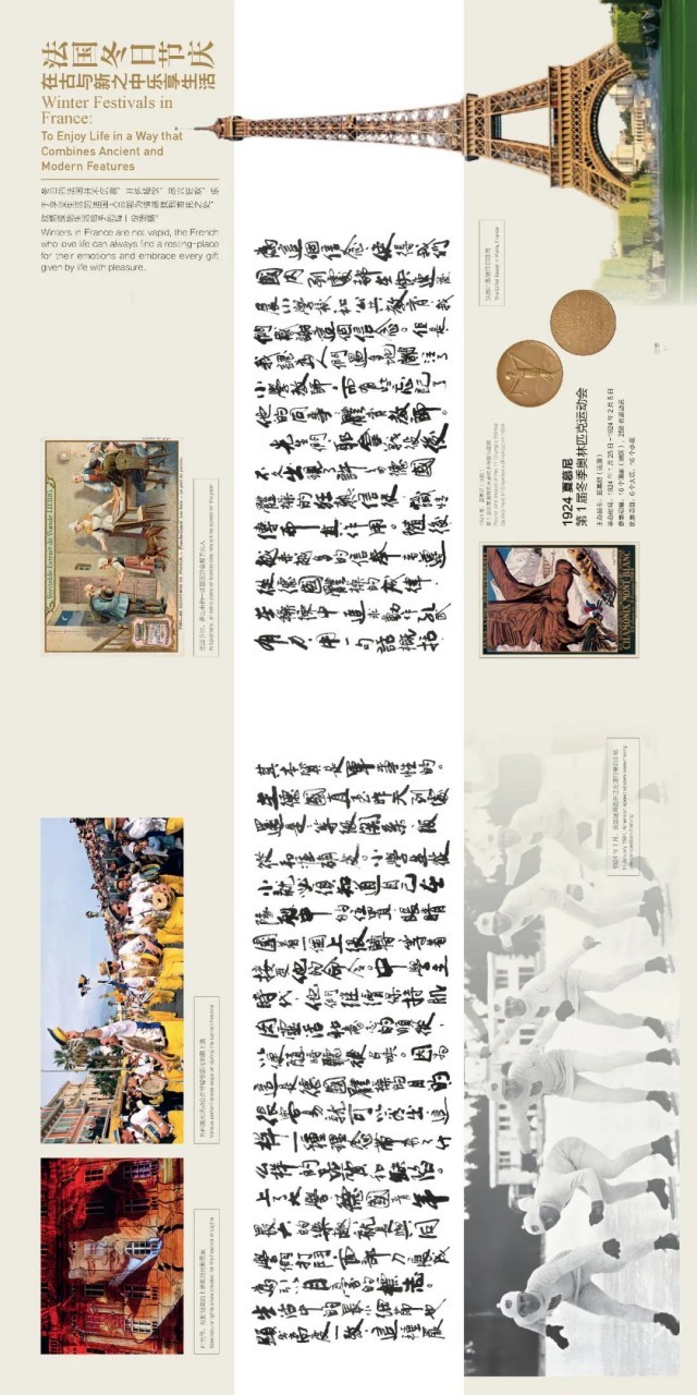“《奥林匹克宣言》——美丽的奥林匹克文化长卷Ⅲ”左右两翼分别以展示希腊雅典和法国巴黎暨两国与两城奥林匹克运动的历史与文化相关内容作为起点,以举办过夏季和冬季奥运会的23个国家及其43个城市的节日为内容,展示举办国和城市多元的文化风貌,最后汇集于中心部分的“奥林匹克宣言广场”与“双奥之城”中国北京的春节文化,寓意着东西方文明相向而行,在北京相遇并融合发展,以此绘就一幅人类命运共同体的美丽画卷。