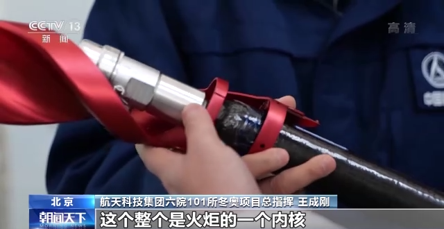 航天科技集团六院101所所长 王成刚:整个是火炬的内核,我们称之为氢芯。这一部分是我们的气瓶,铝合金内胆,碳纤维缠绕主要是考虑到安全性,它的承压能力要达到42兆帕。应该属于高压的范畴了,必须要把储存在气瓶里的氢气要给减压到常压的状态,这是我们航天的专有技术。