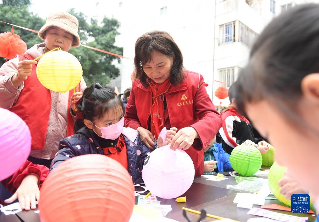 2月15日,吴清菊(中)在福州市鼓楼区五凤街道永恒社区教小朋友装饰花灯。