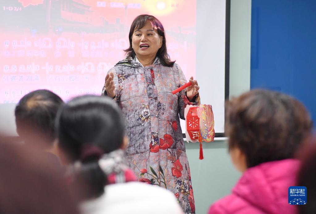 2月14日,在福州市晋安区茶园街道新时代文明实践所,吴清菊为社区居民介绍台湾元宵节习俗。