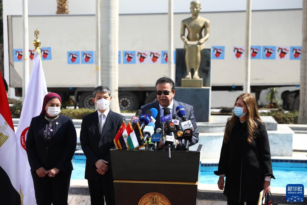 2月20日,在埃及吉萨省,埃及高教科研部长兼代理卫生部长加法尔(右二)在中埃联合向加沙地带援助新冠疫苗启运仪式上致辞。