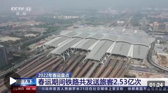 2月25日,为期40天的2022年铁路春运结束。全国铁路共发送旅客2.53亿人次、同比增长16%,春运期间,全路日均开行旅客列车8498列。
