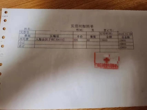严力购买凝血因子的发票清单 受访者 供图