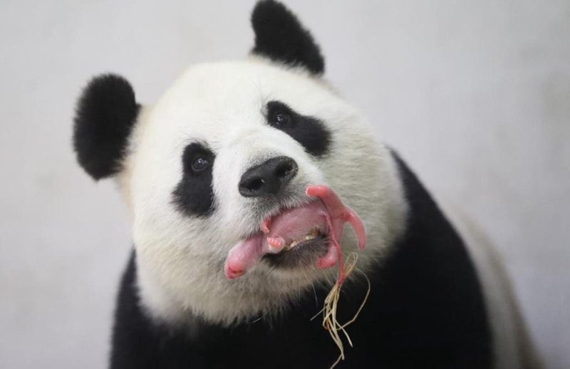 2016年6月2日,在比利时布吕热莱特市的天堂动物园,初为妈妈的大熊猫“好好”口叼幼崽。新华社发(天堂动物园供图)