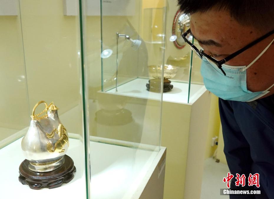 3月1日,一位市民参观鎏金舞马衔杯纹银壶复制品。近日,在陕西西安北郊一商场内,由陕西历史博物馆联合荷兰艺术家苏珊·德鲁门为公众带来“花舞大唐”艺术展。16件何家村窖藏出土的大唐珍宝复制品,环绕着展区中央1件大型水晶艺术装置作品。该展览吸引了不少市民参观。 中新社记者 张远 摄