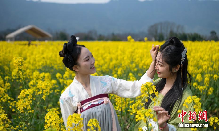 油菜花田里游玩的汉服爱好者。中新社记者 刘忠俊 摄