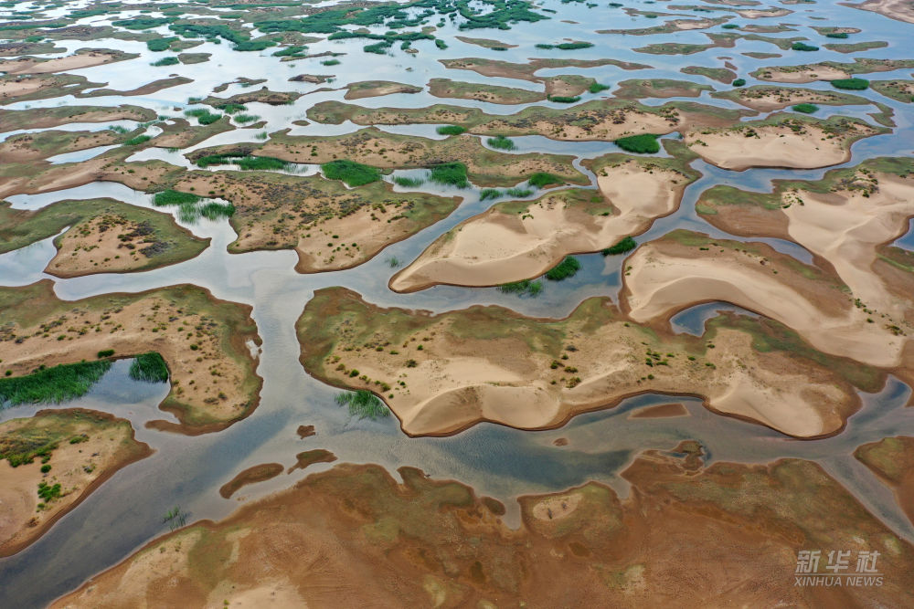↑这是在内蒙古杭锦旗巴音温都尔嘎查拍摄的库布其沙漠湿地(无人机照片,2021年7月16日摄)。2014年以来,水利部门每年在黄河凌汛期向库布其北部的洼地分凌引水,在沙漠中形成湿地。