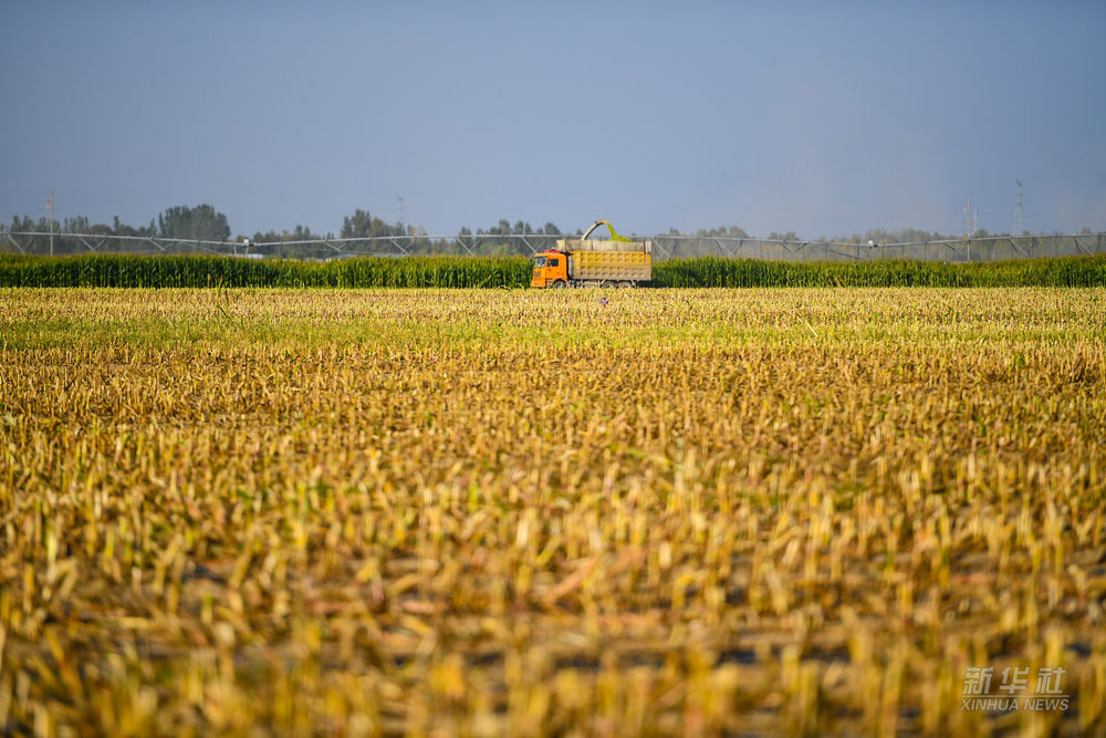 ↑内蒙古鄂尔多斯市达拉特旗展旦召苏木的农民使用大型机械收获青贮玉米,为当地养殖业提供优质饲料(2021年9月26日摄)。近年来,达拉特旗通过实施粮改饲项目,调整农业种植结构,引导农民种植青贮玉米,助力农民增收。