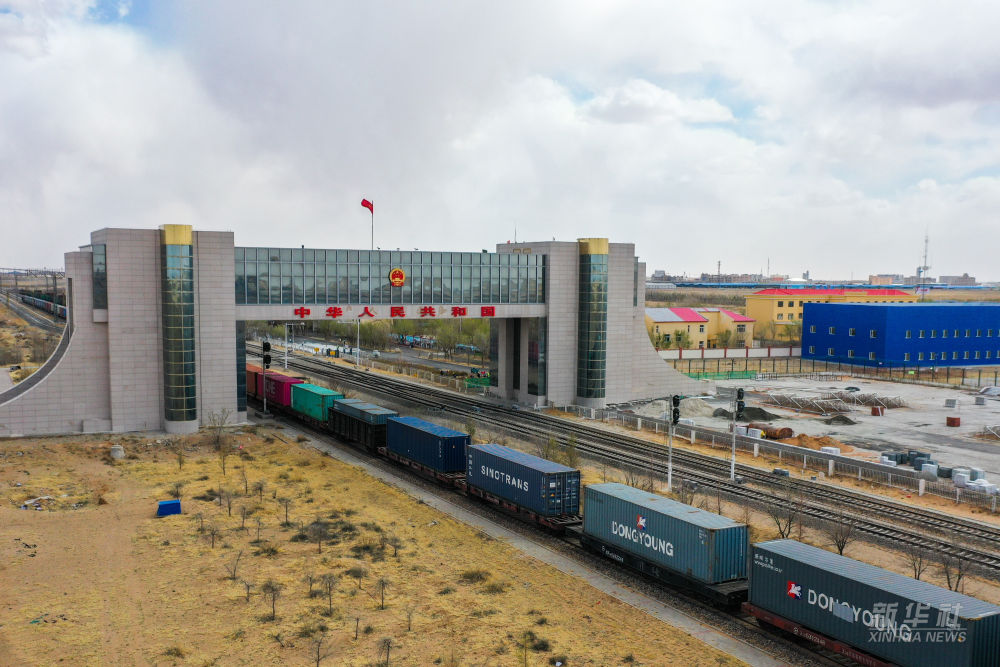 ↑一列中欧班列驶出二连浩特国门(无人机照片,2021年4月28日摄)。数据显示,2021年二连浩特铁路口岸完成进出口运量1605.10万吨,连续第二年突破1600万吨大关;接运出入境中欧班列2739列,同比增长15.1%,再创历史新高。