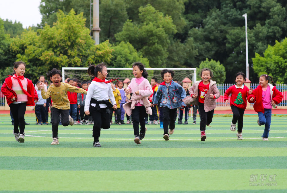↑2021年秋季学期开学以来,各地积极落实“双减”政策,利用课后服务时间开展内容丰富、形式多样的课外活动,促进学生全面发展。这是在湖南省永州市新田县双碧小学,孩子们在运动场上做游戏(2021年11月4日摄)。