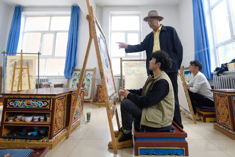 ↑在青海民族大学艺术学院,教师夏吾才让(中)在指导工艺美术专业学生绘制唐卡(2021年6月17日摄)。唐卡是藏族文化中独具特色的绘画艺术形式,具有鲜明的民族特点,被称为藏族的“百科全书”,也是中华民族弥足珍贵的非物质文化遗产。