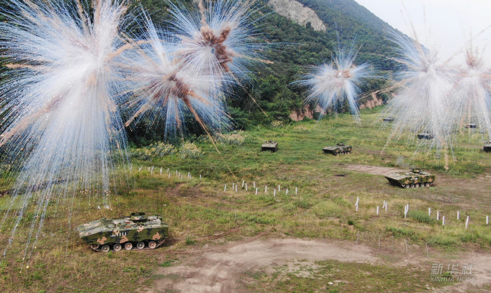 ↑对抗演练中,陆军第83集团军某旅“红一连”某型步战车利用烟幕掩护,向“敌”阵地发起冲击(2021年7月4日摄)。