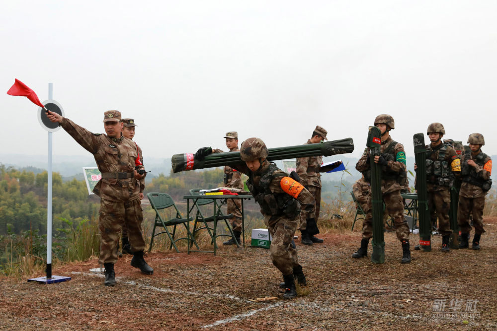 ↑在“精武联勤-2021”战斗体能比武中,参赛队员携装从起点出发(2021年12月13日摄)。