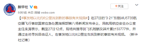 在27日的“3·21”东航MU5735航空器飞行事故国家应急处置指挥部第八场新闻发布会上,民航局航空安全办公室主任朱涛表示,截至27日12点,现场共搜寻到飞机残骸及碎片累计33777件,并通过走访寻找目击证人,在事发地以北8公里左右找到新的事故有关视频。