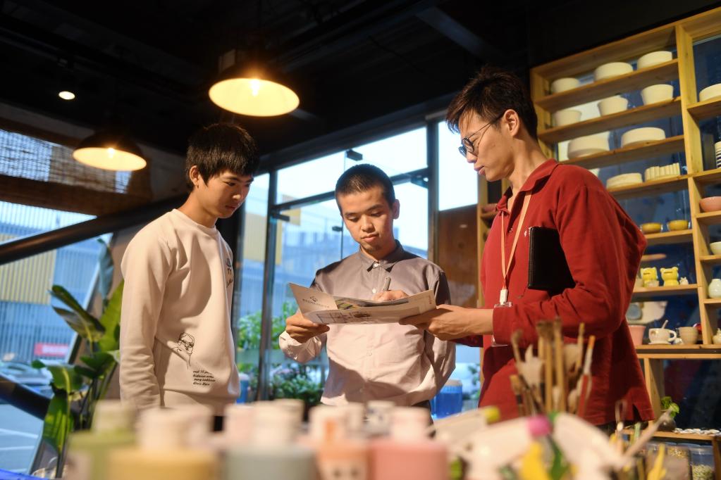 在福州市台湾青年创业就业基地,台湾青年(右一)讨论产品策划方案。新华社记者 林善传 摄