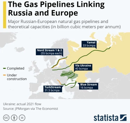 截至2021年,俄罗斯输欧主要天然气管道示意图。绿线为已建成管道、黄线为建设中管道,包括如今被冻结的“北溪-2号”。图片来源:Statista