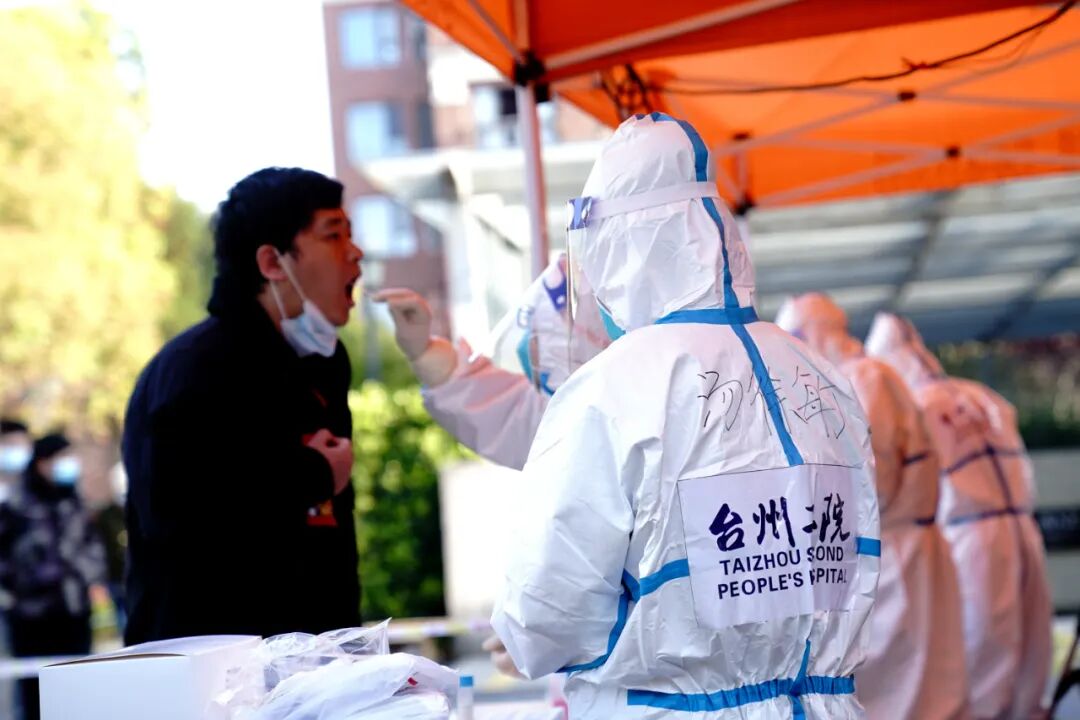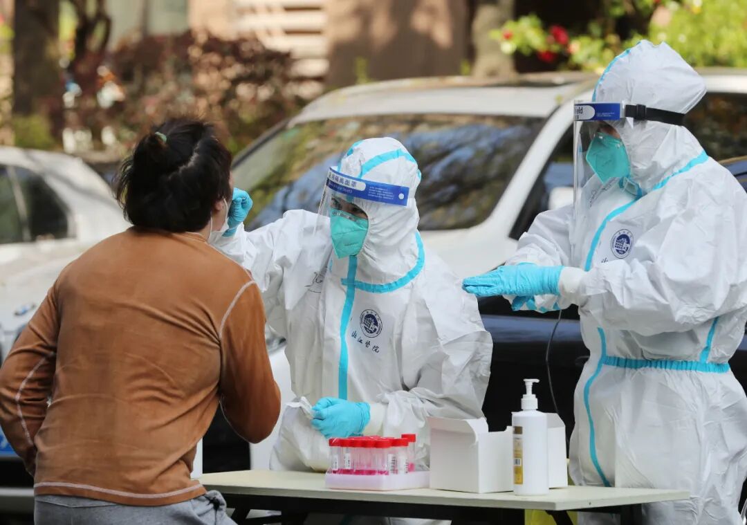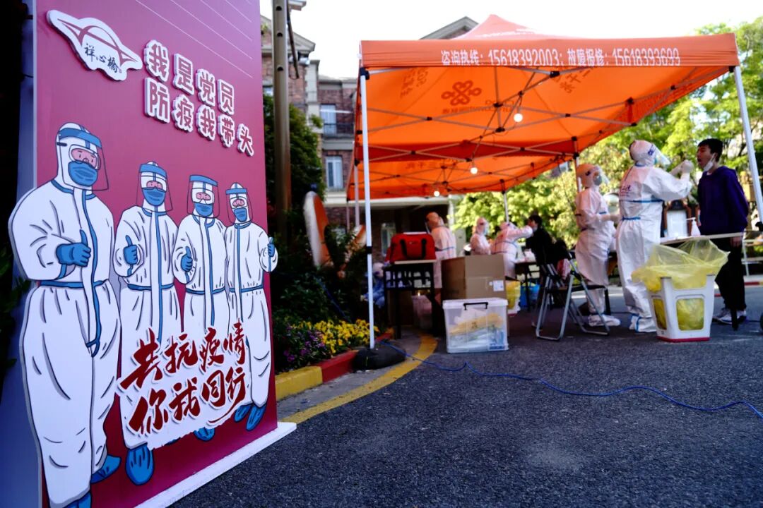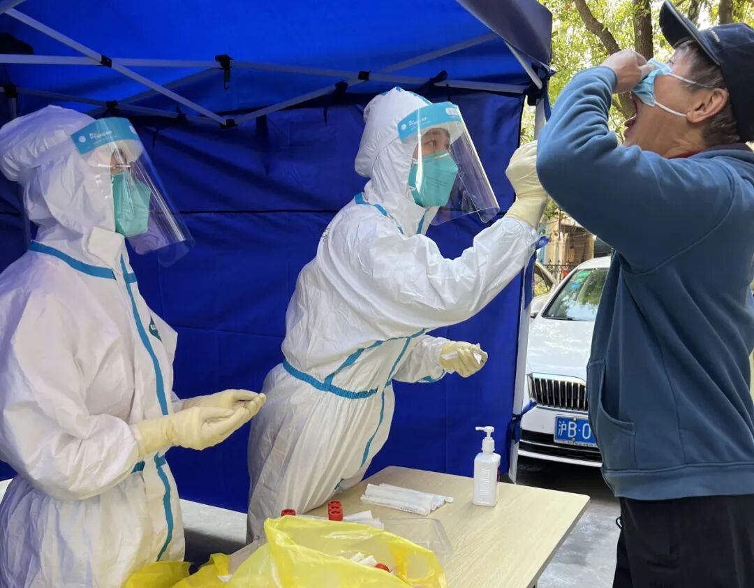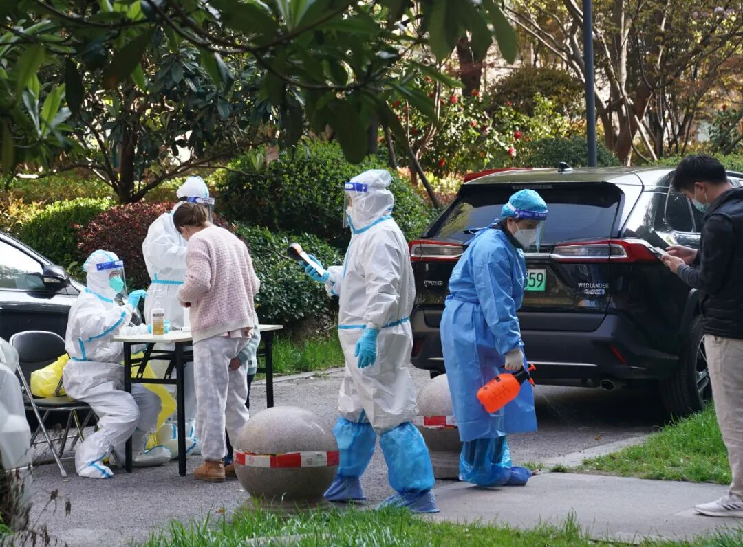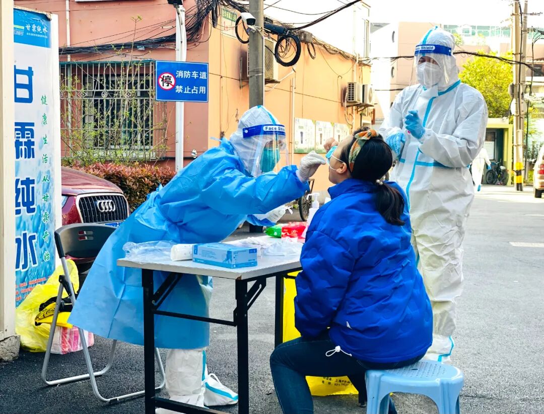 4月4日,在普陀区白玉苑小区,来自浙江丽水的医疗队为小区居民进行核酸采样。新华社发(郑非非 摄)