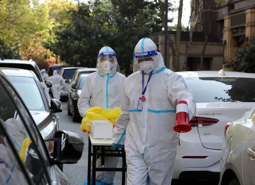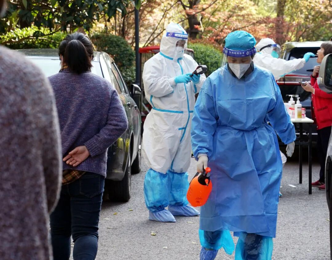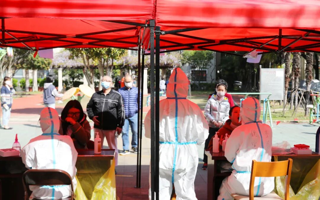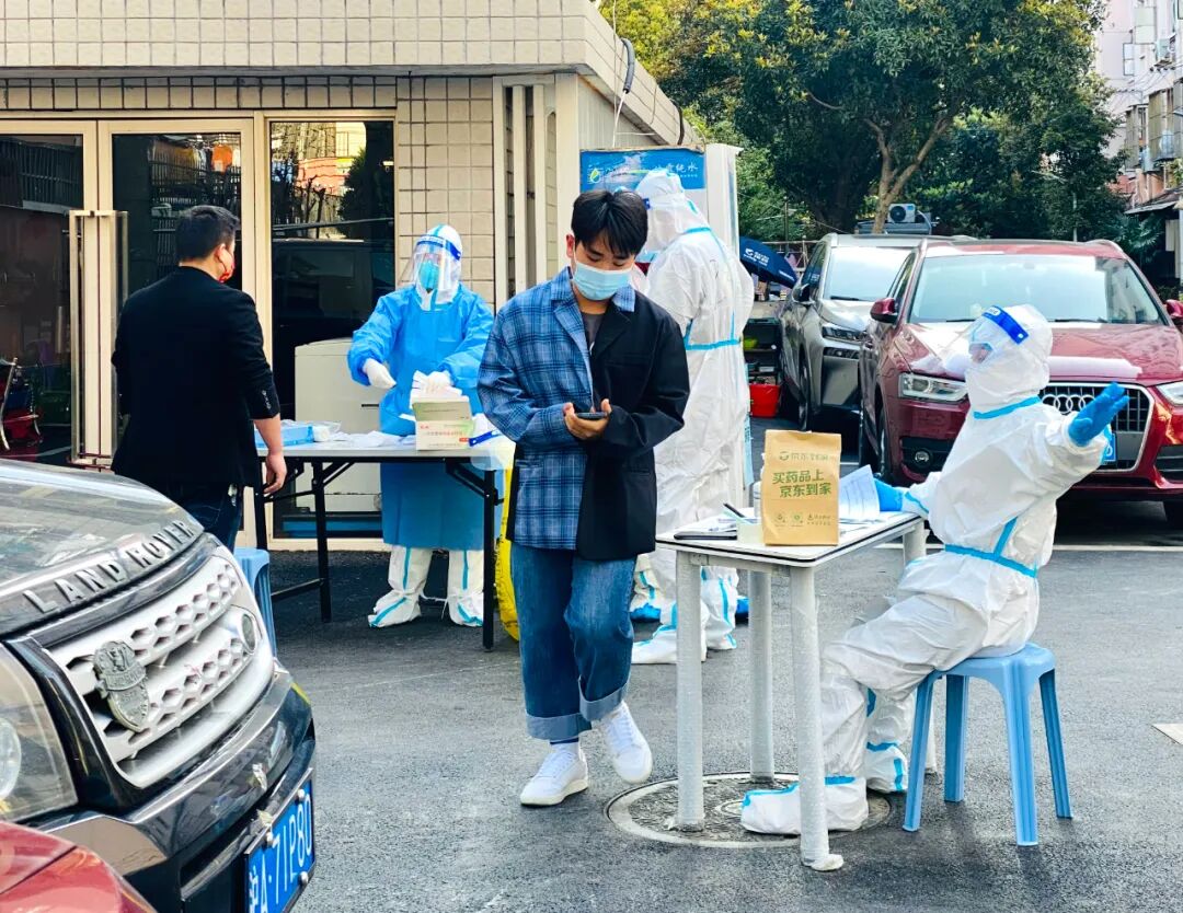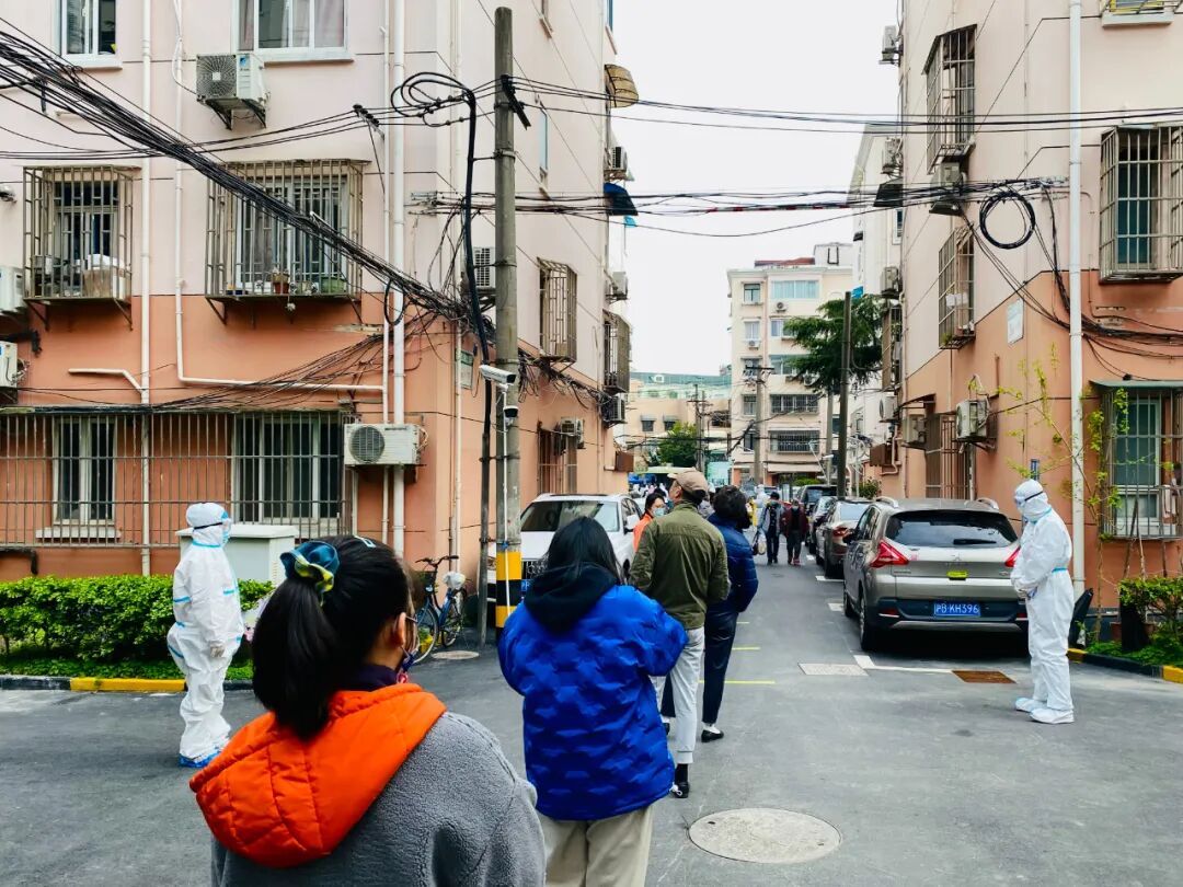 4月4日,检测人员在徐汇区漕河泾街道一小区内为居民进行核酸采样。(徐盛珉 摄)