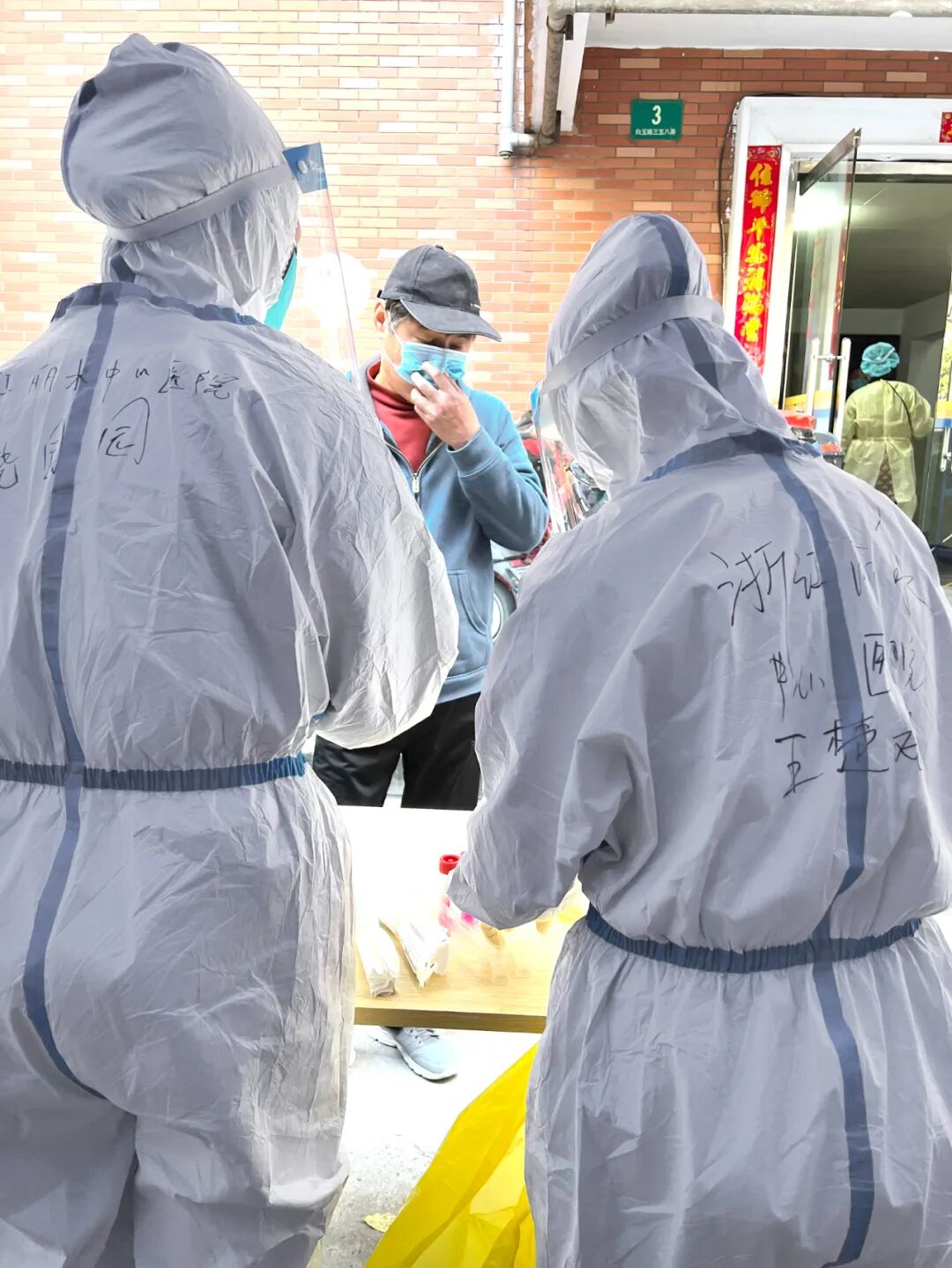 4月4日,来自安徽蚌埠的援沪人员为徐汇区一小区居民进行核酸采样。(潘鹂声 摄)