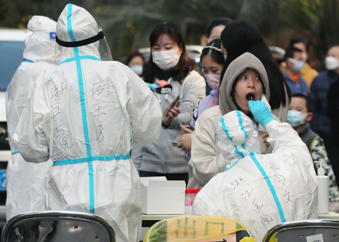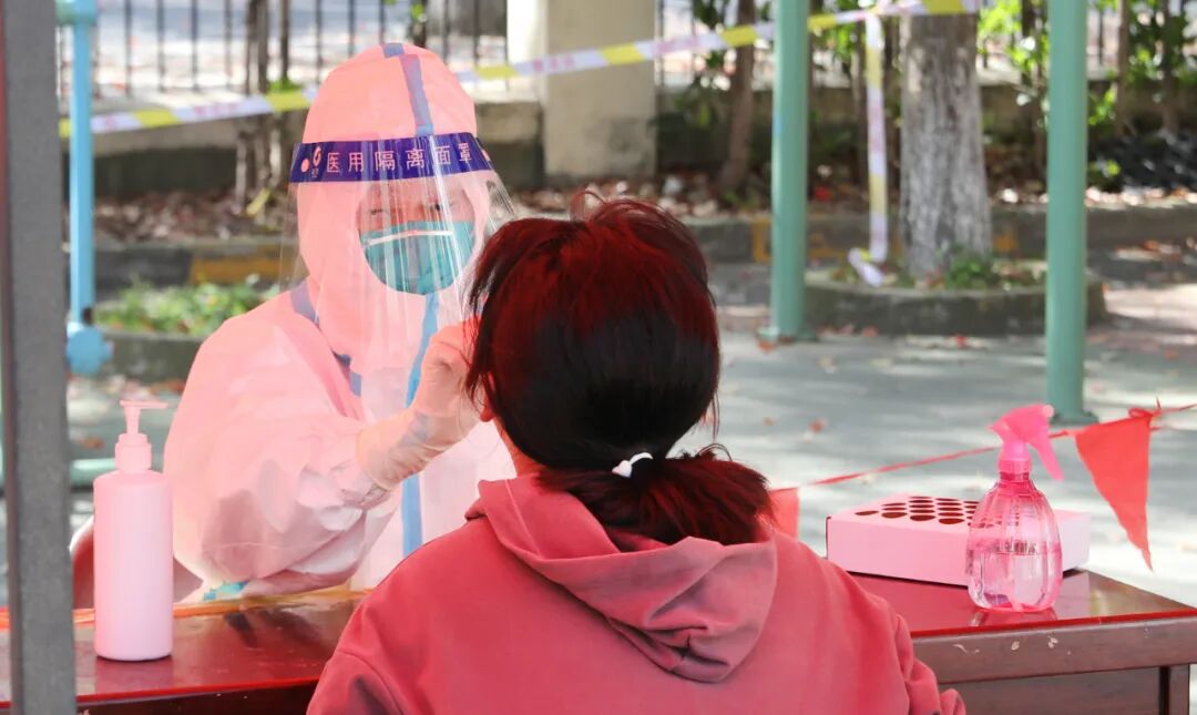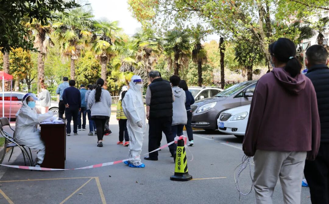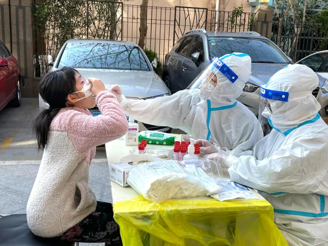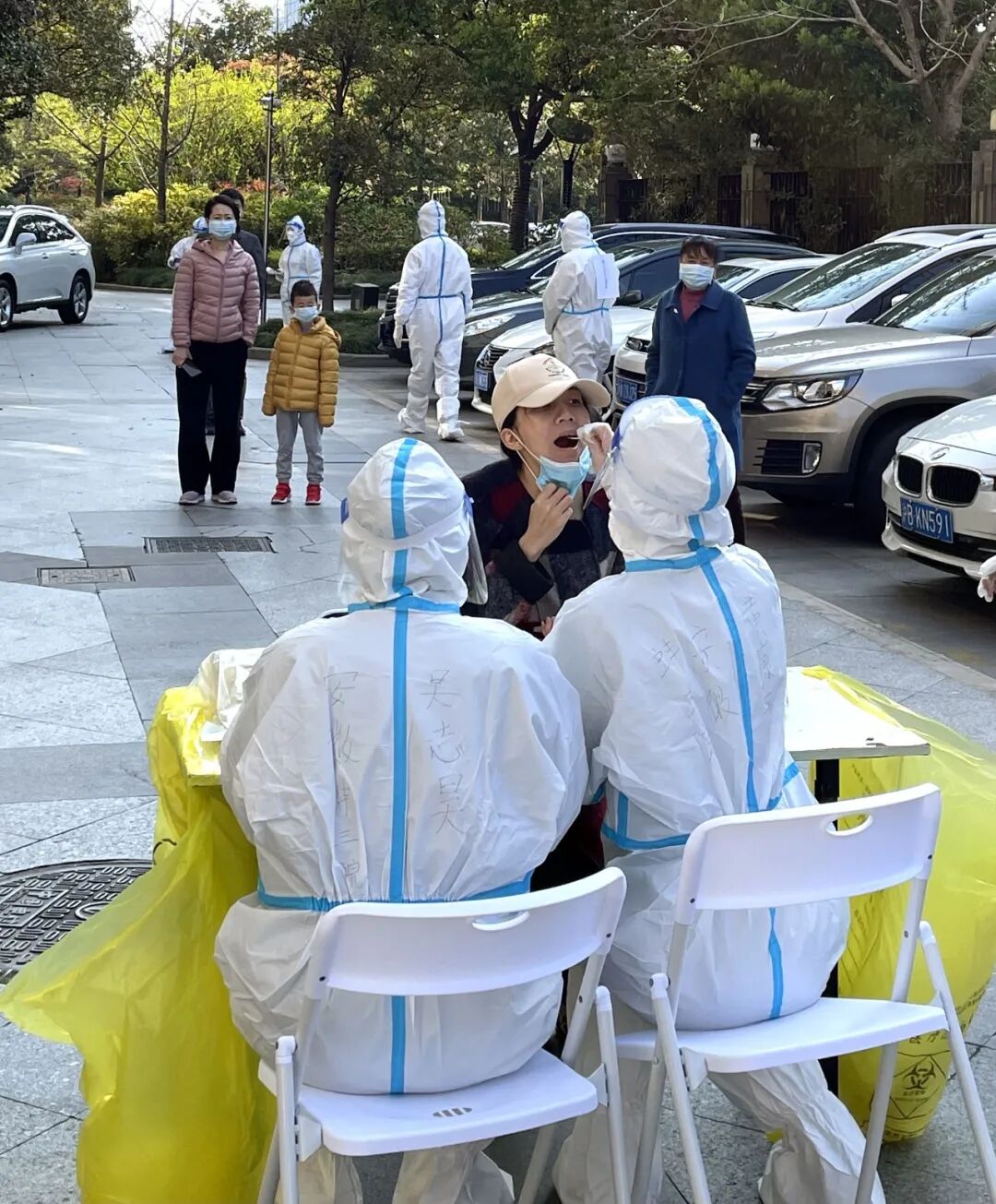 小区今日采取了新的采样方式 ,“居民不动医护动”,在每个楼栋门口进行采样,避免聚集,交叉感染。新华社记者 刘颖 摄