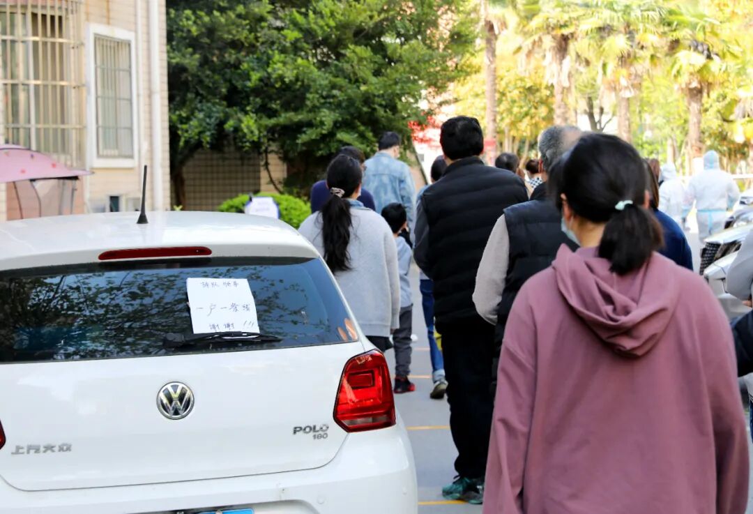 4月4日,闵行区七宝镇一小区内,居民在接受核酸采样。 新华社记者方喆摄