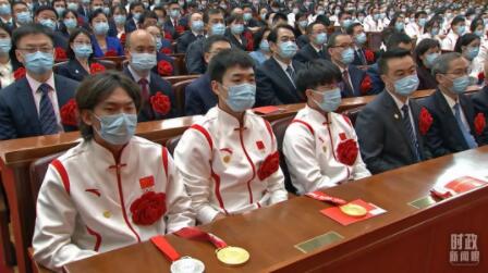 △苏翊鸣(左一)、高亭宇(左二)两位北京冬奥会冠军带着奖牌参加总结表彰大会。(总台央视记者杨立峰拍摄)