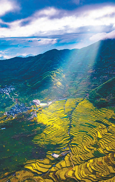 一缕阳光投射在东澄村千年梯田中的油菜花海。开垦并种植千年的千年梯田位于覆卮山的北坡,2.3万余块共计2300多亩的梯田由山腰倾泻而下,气势磅礴,绮丽壮观,成为东澄村重要的观光景点。