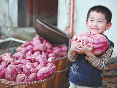东澄村红薯丰收,一个小朋友挑出家里最大的一个红薯招待远道而来的客人。目前,全村共有民宿、农家乐46家,接待能力越来越强,各类旅游业从业人员近300人。