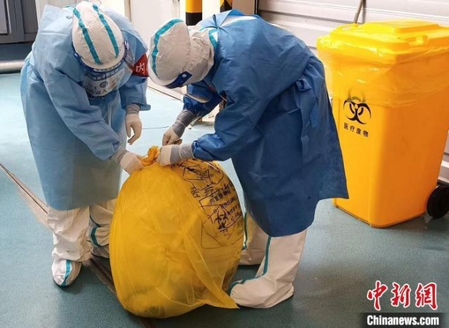 每一轮值班,内感护士总是第一个“逆行”进入舱内。除了保证舱内各通道的安全和监督队友们脱卸,拎着一袋又一袋的医废穿梭在病区走廊,他们还要时刻保持“火眼金睛”。