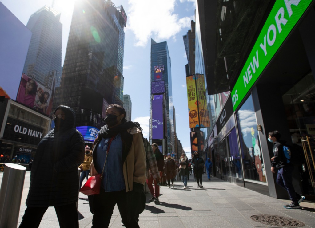 3月29日,人们走在美国纽约时报广场。新华社记者王迎摄