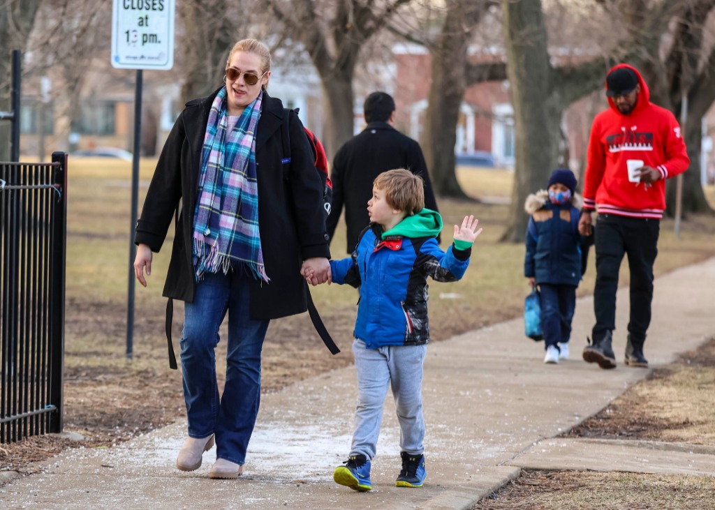 3月14日,在美国芝加哥,家长护送孩子上学。当天,美国芝加哥公立学校取消在校必须佩戴口罩的规定。新华社发(乔尔·莱纳摄)