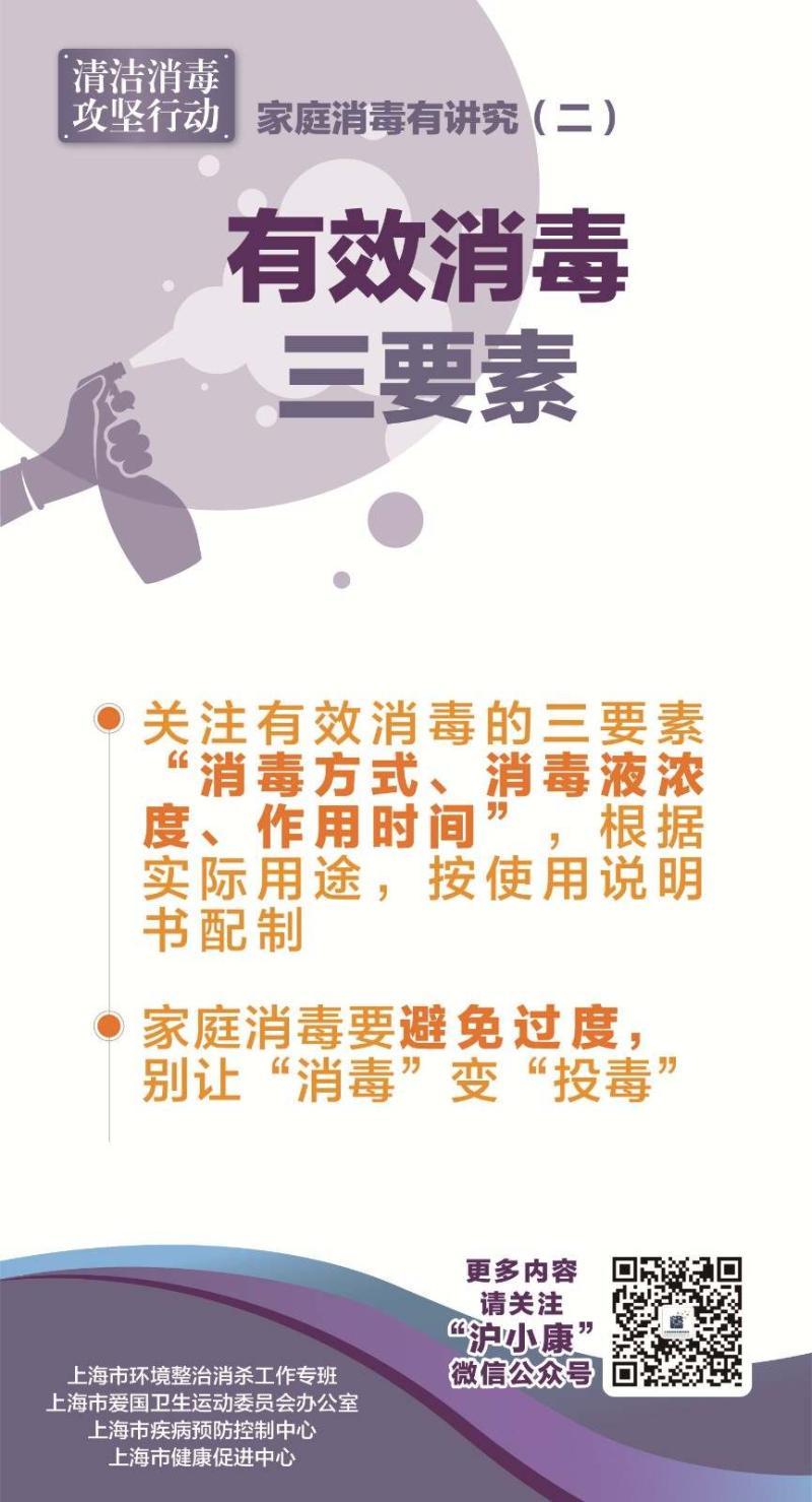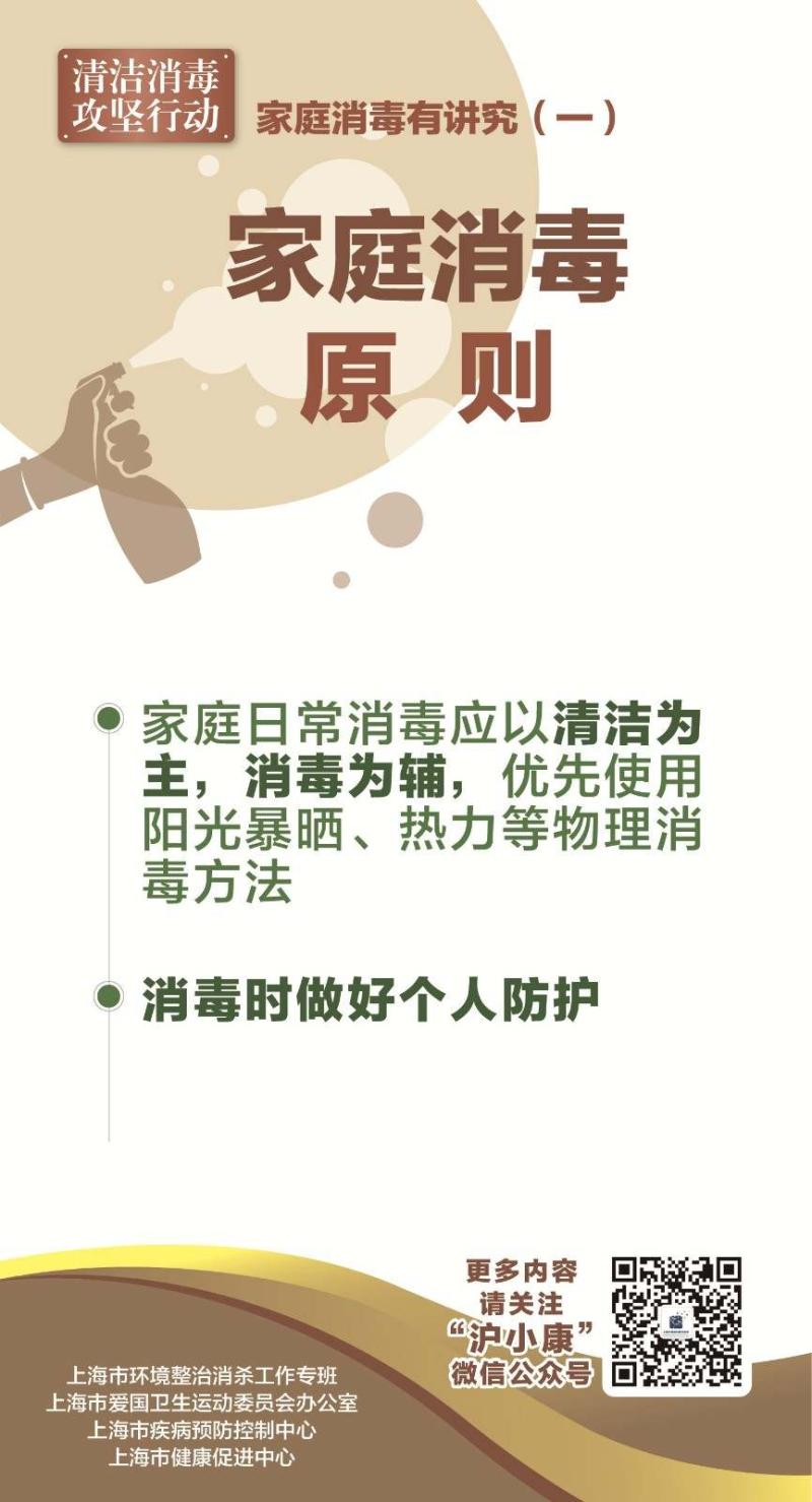 加强家庭日常清洁,科学开展消毒,有助于降低家庭成员感染风险,有效保护家庭成员身体健康。为此,上海市环境整治消杀工作专班、市爱国卫生运动委员会办公室会同市疾控中心、市健康促进中心开发了一套十张家庭清洁消毒的宣传海报,涵盖消毒原则、消毒要素及消毒方法等一系列要点,从具体消毒剂的使用到各类物品消毒,帮助广大市民主动掌握规范、专业的家庭清洁、消毒方法,共同筑牢全社会疫情防控屏障。