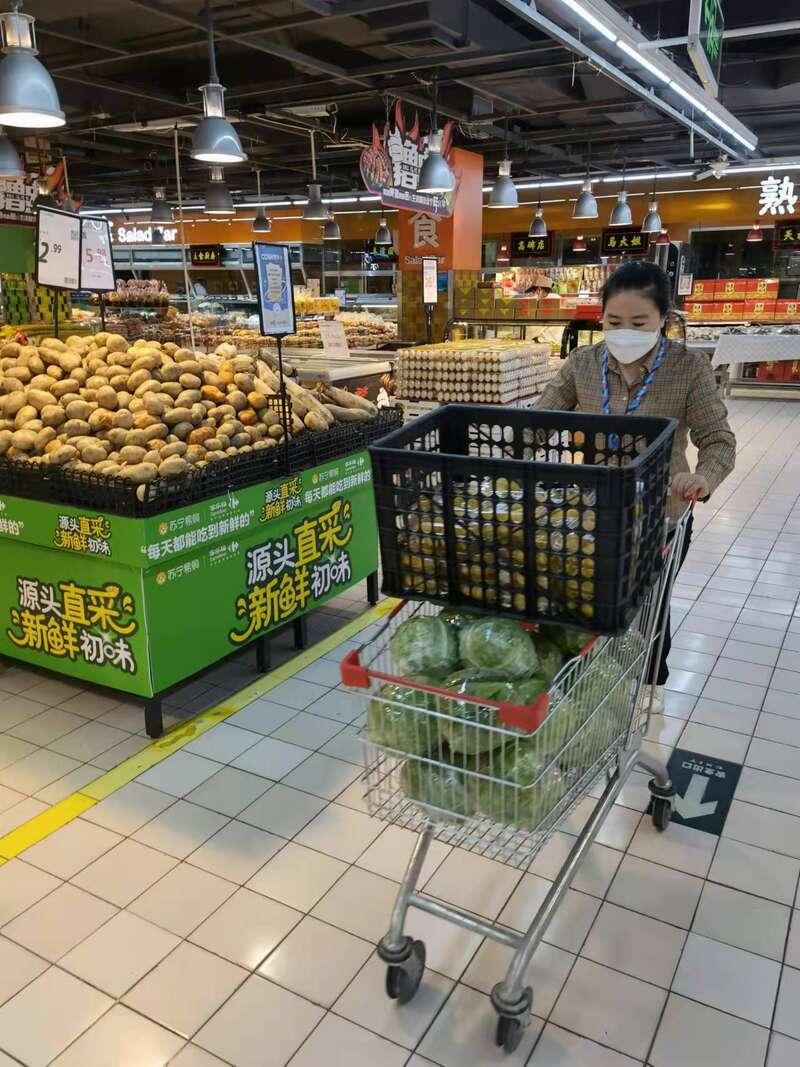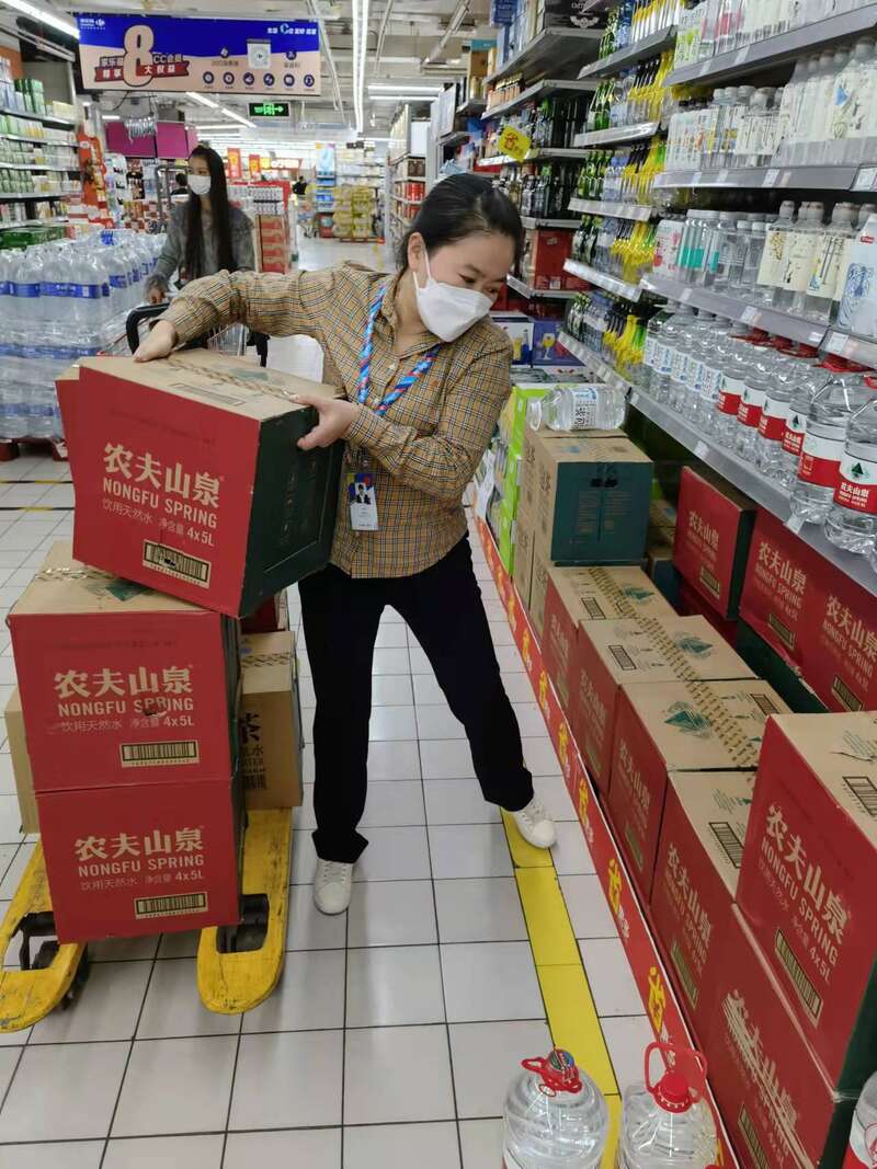 杜娟还记得,4月24号晚,收到管控消息,周围的小区居民开始有些恐慌,当晚的客流量达到了平常的五六倍,正常营业时间从晚上九点半推迟了一小时,卖场比过年还“热闹”。她紧急和采购部沟通,将配货量提至5倍。