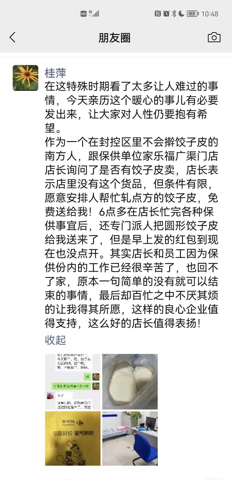 需要饺子皮的封控居民发朋友圈,给杜娟点赞。(受访者供图)