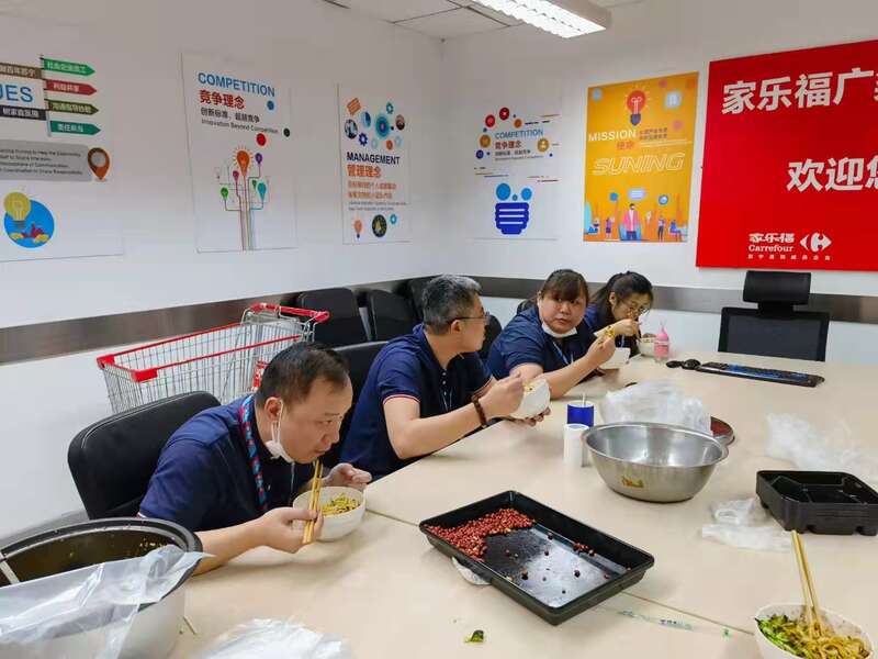 店员们一起吃杜娟做的炸酱面。(受访者供图)