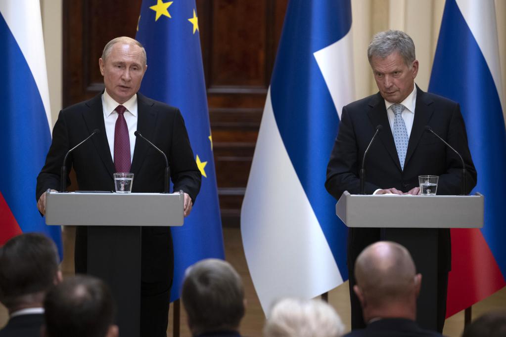 2019年8月21日,在芬兰赫尔辛基,俄罗斯总统普京(左)与芬兰总统尼尼斯托出席联合记者会。新华社发(马蒂·马蒂凯宁摄)