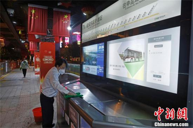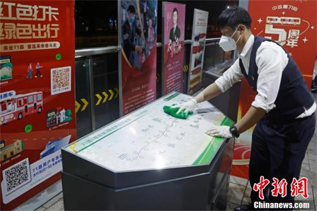 5月20日晚,71路中运量公交车的部分司机和保洁人员正在对外滩站进行站台清洁。据上海市交通委主任于福林介绍,上海拟从5月22日起逐步恢复跨区公共交通。