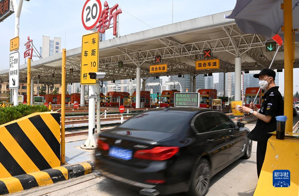 在西安绕城高速高新收费站,费率显示牌上显示为西安行程的车辆正常通行,无需任何检查(5月20日摄)。