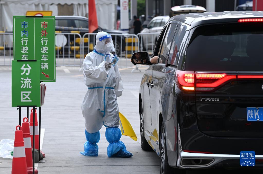 在西安绕城高速曲江收费站,工作人员对挡风玻璃上放置有“车辆待查提示牌”的市外行程车辆进行陕西一码通、行程码查验(5月21日摄)。