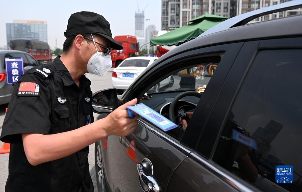 在西安绕城高速高新收费站,工作人员对挡风玻璃上放置有“车辆待查提示牌”的市外行程车辆进行陕西一码通、行程码查验(5月20日摄)。